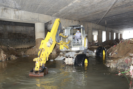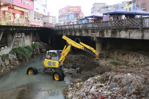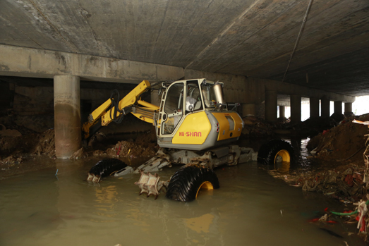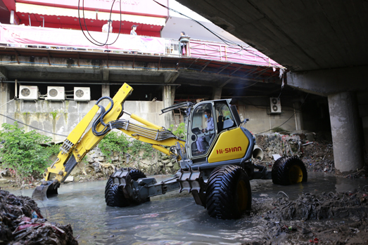 在第14號(hào)臺(tái)風(fēng)“莫蘭蒂”來臨之際,海山機(jī)械緊急出動(dòng)高端應(yīng)急救援裝備——非破壞性挖掘抽吸車和步履工作平臺(tái)趕赴仙游郊尾鎮(zhèn),對一座大橋下堵塞嚴(yán)重的河道進(jìn)行清理。本次施工運(yùn)用抽吸車和步履工作平臺(tái)聯(lián)合作業(yè),發(fā)揮抽吸車長距離作業(yè)、強(qiáng)力抽吸和步履的機(jī)動(dòng)靈活、全地形通過、“上山下河”特點(diǎn),解決了普通機(jī)械設(shè)備無法進(jìn)入河道和清理出來的垃圾物無法運(yùn)輸?shù)碾y題。經(jīng)過設(shè)備的緊急挖掘、抽吸疏通,使堵塞嚴(yán)重的河道保持暢通,確保暴雨來臨時(shí)河道水流暢通。