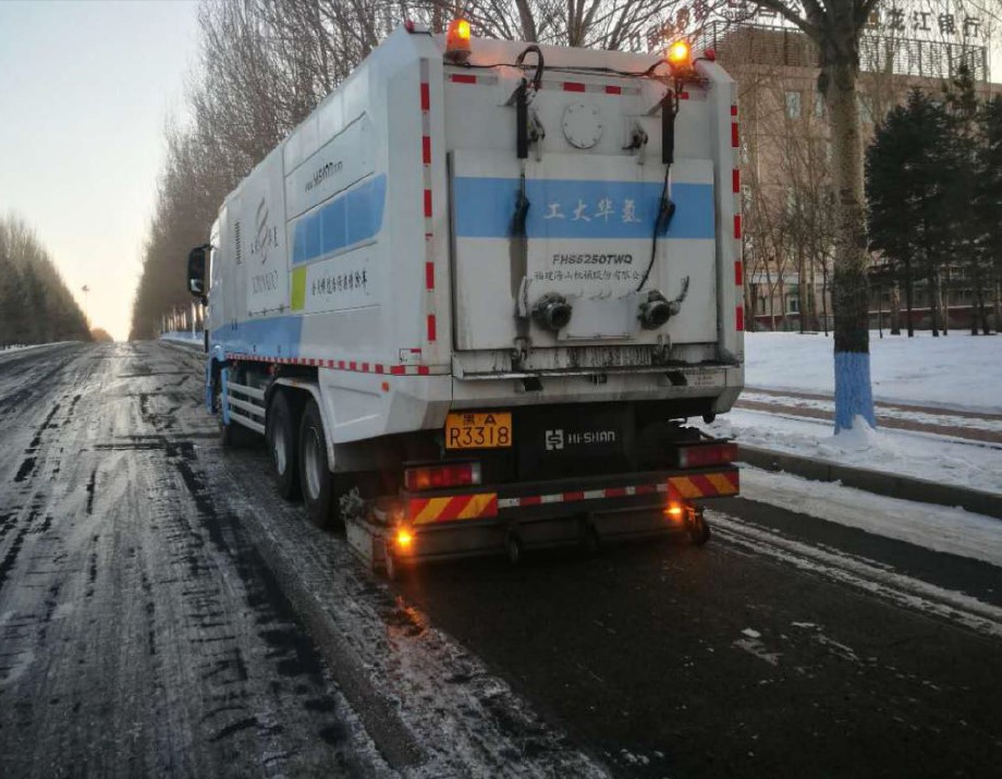 海山機(jī)械自主研發(fā)的道路污染清除車,對解決道路積垢、板結(jié)、油污、生化品等污染物清除的難題,以及道路機(jī)能恢復(fù)、降噪、延長道路使用壽命及降低PM2.5揚(yáng)塵污染有顯著成效。除此之外,眾多關(guān)鍵技術(shù)的結(jié)合解決了冬天路面薄冰難除、易發(fā)生交通事故的難題,有效減少或避免每年因人工除冰作業(yè)時發(fā)生的人員傷亡事故,大幅降低環(huán)衛(wèi)人員傷亡率及相關(guān)財產(chǎn)損失。