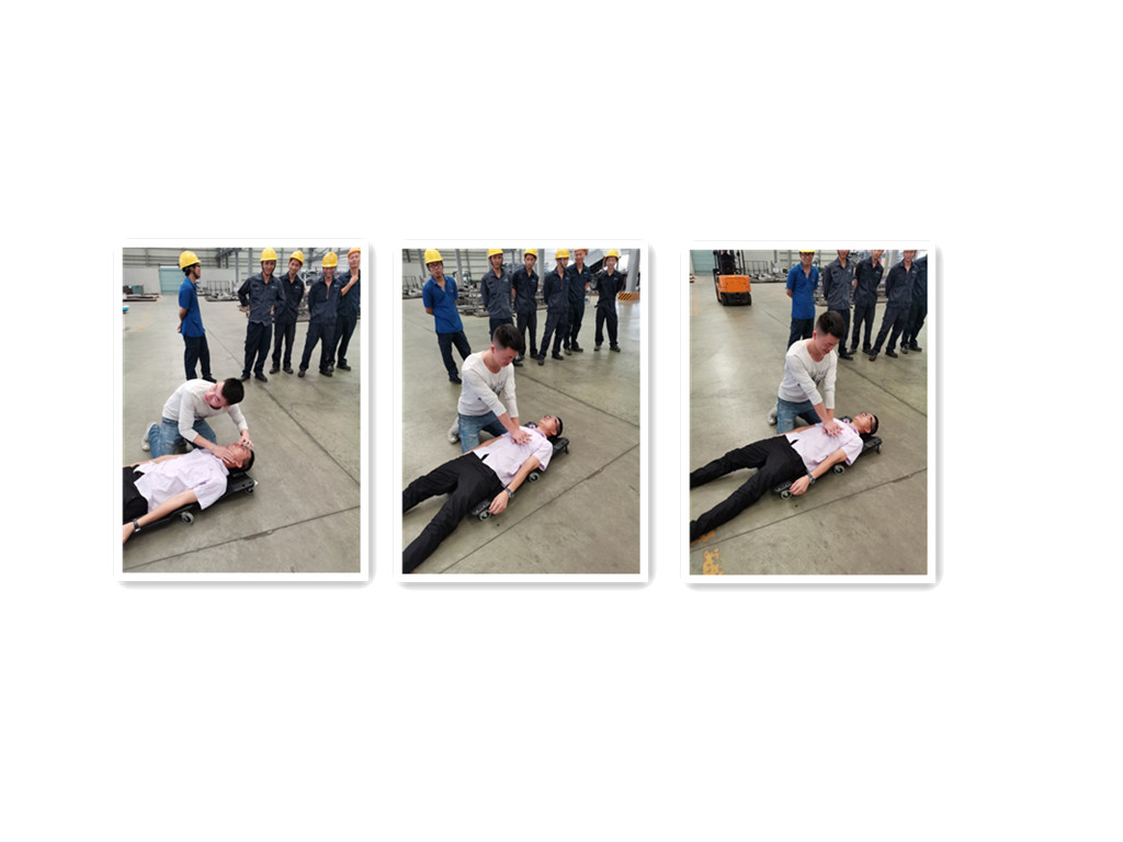 2、2021年7月26日上午10:00分左右,制造部車間員工XXX在作業(yè)過程中突然出現(xiàn)中暑現(xiàn)象,現(xiàn)場應(yīng)急人員立即將中暑人員轉(zhuǎn)移到陰涼通風處,并讓病人平臥,解開衣扣,松開或脫去衣服,按摩軀干和四肢的皮膚肌肉,加速外圍血液循環(huán),促進散熱(或用冷水或用冰袋置于病人的頭、頸、腋下、腹股溝等處,或用酒精擦拭病人的頭、頸、腋下、腹股溝等處進行散熱)。針對重度中暑者,在采取上述措施的同時,立即撥打120,將患者迅速送往有條件的大醫(yī)院急診科治療。一旦發(fā)現(xiàn)病人呼吸、心跳停止應(yīng)立即進行心肺復蘇。中暑急救演練、人工呼吸及胸外心臟按壓法演練圖片如下: