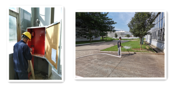 1、2022年6月24日下午14:30分左右,公司廠內(nèi)制造車間因車輛添加液壓油時(shí),不小心飛濺一些到放置車底下的紙皮上,調(diào)試人員未及時(shí)將含有液壓油的紙皮按要求進(jìn)行處理。該車輛剛好有一項(xiàng)技改項(xiàng)目需要完成,配焊人員在焊接前未注意觀察車底情況,導(dǎo)致在焊接時(shí)火星不斷飛濺到含油紙皮上,于14:55分左右出現(xiàn)火情?,F(xiàn)場應(yīng)急人員立即組織消防逃生及滅火,并立即報(bào)告應(yīng)急辦公室,由應(yīng)急辦公室立即向應(yīng)急指揮部報(bào)告。應(yīng)急指揮部根據(jù)初期火情控制情況(應(yīng)急救援人員滅火得當(dāng),于14:56分左右使用滅火器將火撲滅)及預(yù)警級別(車間級),啟動(dòng)車間級應(yīng)急響應(yīng)。相關(guān)部門配合做好應(yīng)急響應(yīng)工作,待達(dá)到應(yīng)急終止條件后,終止應(yīng)急響應(yīng)。最后對現(xiàn)場進(jìn)行洗消、并進(jìn)行工作總結(jié)與評估。突發(fā)環(huán)境事件應(yīng)急預(yù)案演練圖片如下: