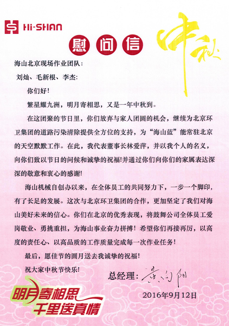 Though all team members could not be with their family on this day, they were so moved by one special gift prepared by Huang Xiangyan, general manager of Hishan Machinery. A consolation letter, plus mooncakes and a feast, was delievered to the Hishan Blue squad in Beijing. On this special day, Hishan HQ did not forget about Beijing squad. Hope the Beijing mission work out all well.