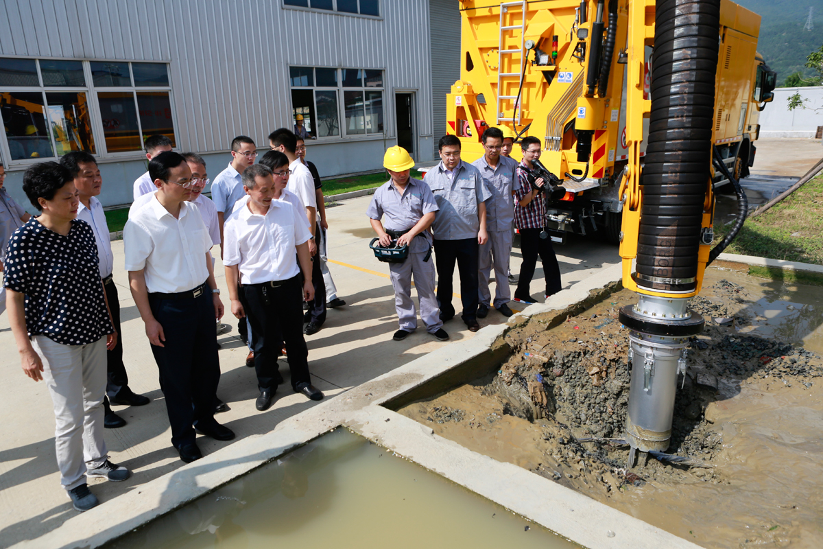 In the morning, Lin Baojin,along with his entourage, viewed in person a live demonstration of the 15-ton all-terrain unmanned walking excavator and 10-ton walking excavator dredging. At the testing site for pneumatic refuse collection system, Lin Aipin,president of Hishan’s? board of directors, introduced to Lin Baojin,that the refuse collection system was designed and developed all by Hishan. The system can be deployed in residential area where residents can throw the waste into the inlet, the mobile vacuum truck then collect and compress the waste periodically and send the waste directly to the waste treatment plant, nothing leaked or spilled during the whole process.